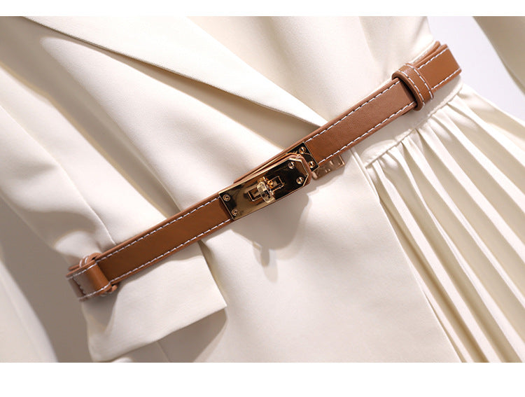 Çapraz blazer yaka ve beli belirginleştiren kuşak detayı güçlü ve şık bir görünüm sunarken, pileli midi etek tasarımı feminen ve zarif bir hava katar.